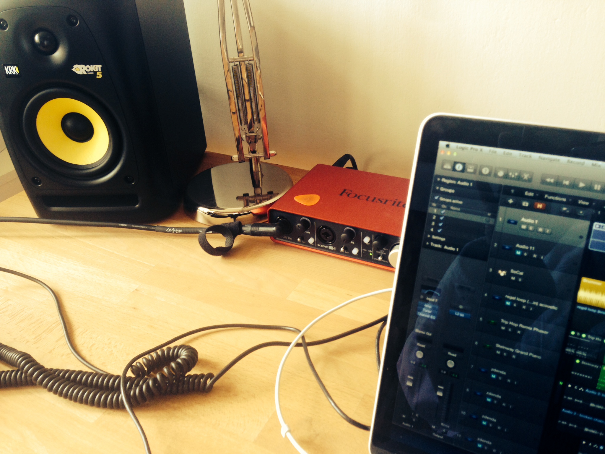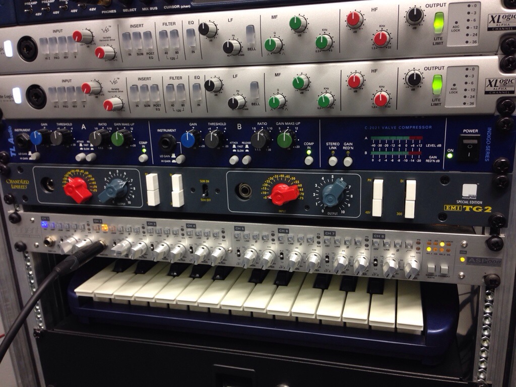 Shure mikrofony na bicí, AKG C4000 na Adrianovu kytaru a TL Audio channel strip VP-1 nebyly moje, ale půjčený od Aleše Albrechta, který s námi strávil na natáčení 2 dny a kromě technickýho supportu nám moc pomohl se zapojením, nastavením a hlavně bezedným pramenem XLR šňůr z jeho zásobárny. Zdálo se neuvěřitelný, kolik jsme tam toho rozmotali. Bylo to něco přes kilometr XLR kabelů a asi 100 metrů prodlužovaček v jedný středně velký místnosti a přilehlý chodbě.